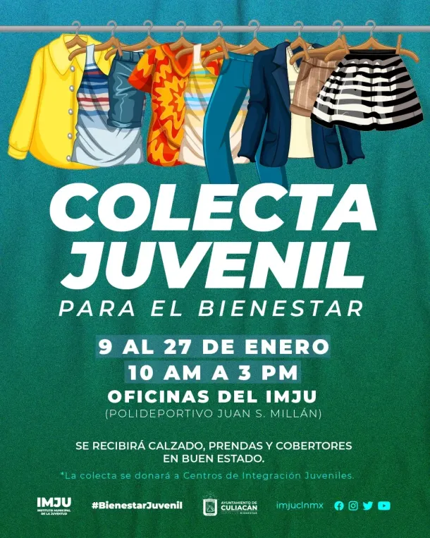 “La Colecta Juvenil para el Bienestar, es con el objetivo de darle una segunda vida a nuestra ropa, también al calzado, cobertores, darle una segunda oportunidad, a veces tenemos ahí ropa guardada en el clóset, ya no la utilizamos, y puede haber muchas personas en situaciones de vulnerabilidad que le podemos estar donando, podemos acercarlas sin problema, parte del objetivo es brindar totalmente gratuito el apoyo, también para llevarlos a centros de integración juvenil con muchachos que están ya rehabilitados”, detalló el funcionario.