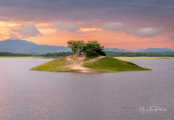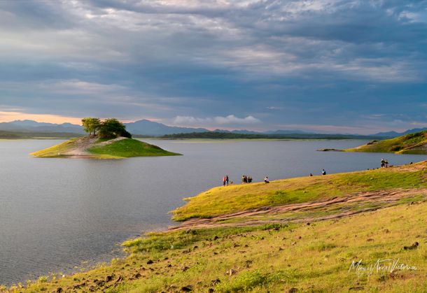 El islote (o península dependiendo del nivel del agua que la presa libere) que se forma en medio del lago con una solitaria línea de árboles, es el centro de la postal, adornad por los caballos semi-salvajes, y el ganado pastando en las verdes praderas, construyen un paisaje de recuerdo bajo cielos libres, lejanos a la ciudad.