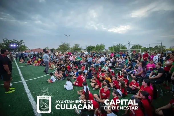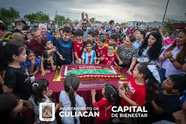 Culiacán, Sin., a 26 de junio de 2024.– En un ambiente de fiesta deportiva, el alcalde Juan de Dios Gámez Mendívil hizo entrega oficial de una cancha de futbol en el fraccionamiento Alturas del Sur.