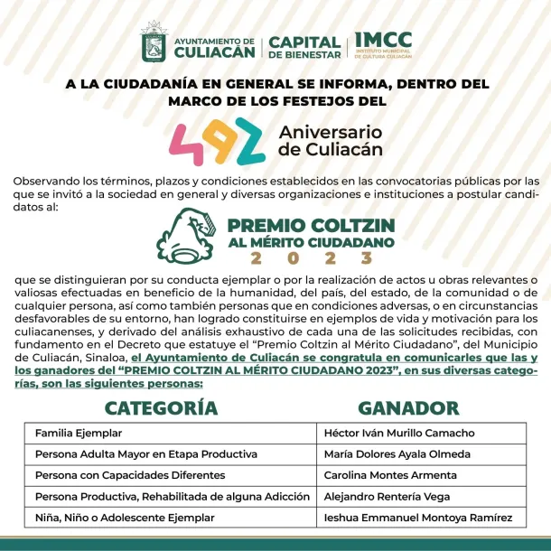 Culiacán, Sin., a, 20 de septiembre de 2023.- El Ayuntamiento de Culiacán se complace en anunciar a los distinguidos ganadores del Premio Coltzin al Mérito Ciudadano 2023.