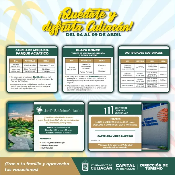 Mientras tanto, IMDEC iniciará las actividades de Semana Santa los días martes 4 y miércoles 5 de abril en el Parque Acuático, con un dinámico torneo de voleibol de playa de tercias femenil y varonil, donde se contarán con premios con bolsa de premios en efectivo para los 3 primeros lugares, dichos premios oscilarán en: 1er Lugar $2,500, 2do Lugar $1,500 y 3er Lugar $1,000 para ambas ramas.
