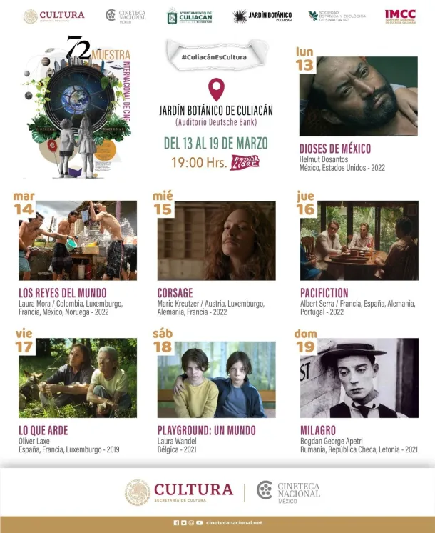 Culiacán, Sin., a 01 de marzo de 2023.- Gracias al convenio de colaboración entre el Instituto Municipal de Cultura Culiacán y la Sociedad Botánica y Zoológica de Sinaloa I.A.P. y al apoyo de la Secretaría de Cultural Federal, se presentará de manera gratuita la 72 Muestra Internacional de Cine de la Cineteca Nacional en el Auditorio Deutsche Bank del Jardín Botánico del 13 al 19 de marzo, con la exhibición de 7 cintas de Francia, Austria, Alemania, Rumania, Italia, Colombia, Bélgica y México.