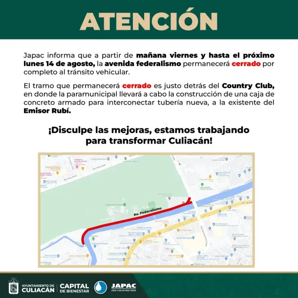Culiacán, Sin., a 10 de agosto de 2023.-  JAPAC informa que a partir de mañana viernes y hasta el próximo lunes 14 de agosto, la avenida Federalismo permanecerá cerrado por completo al tránsito vehicular.