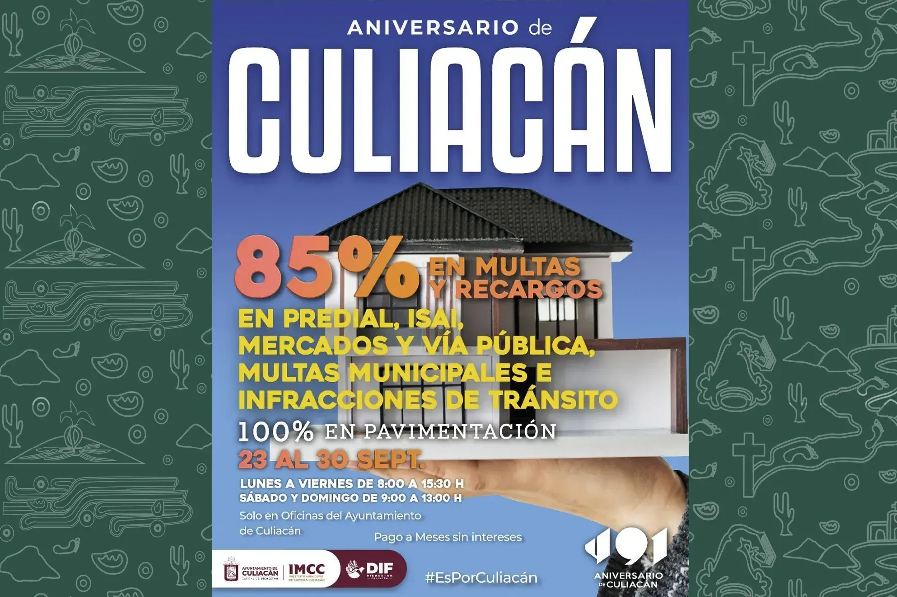 Culiacán, Sin., a 24 de septiembre de 2022.- A partir del viernes 23 y hasta el viernes 30 de septiembre, el Ayuntamiento de Culiacán pone a disposición de la ciudadanía descuentos en multas y recargos para el pago de diversos impuestos, esto como parte de los Festejos del 491 Aniversario de Culiacán.