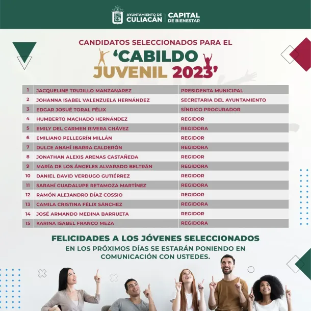 Culiacán, Sin., a 01 de Agosto de 2023.- En el siguiente gráfico se presentan los candidatos seleccionados para el Cabildo Juvenil 2023.