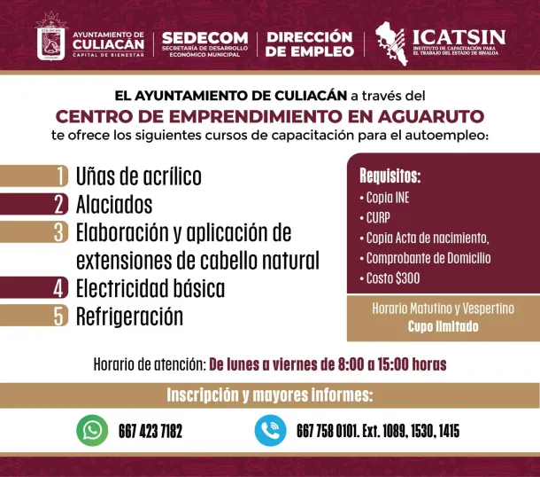 Los interesados deberán llevar estos requisitos al Centro de Emprendimiento de Aguaruto en horario de lunes a viernes de 8 de la mañana a 3 de la tarde, o bien enviarlos al WhatsApp: 6674237182, además para mayor información también pueden llamar al 6677580101 Ext.1089, 1530, 1415.