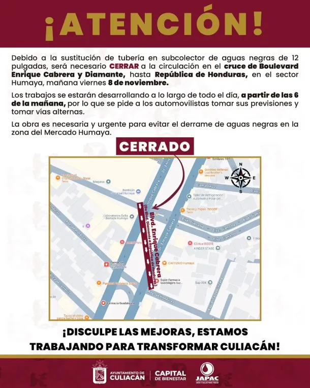 Culiacán, Sin., a 07 de noviembre de 2024.- JAPAC informa que, debido a la sustitución de tubería de subcolector de aguas negras de 12 pulgadas, será necesario cerrar a la circulación el cruce de Boulevard Enrique Cabrera y Diamante, hasta República de Honduras, en el sector Humaya, mañana viernes 8 de noviembre.