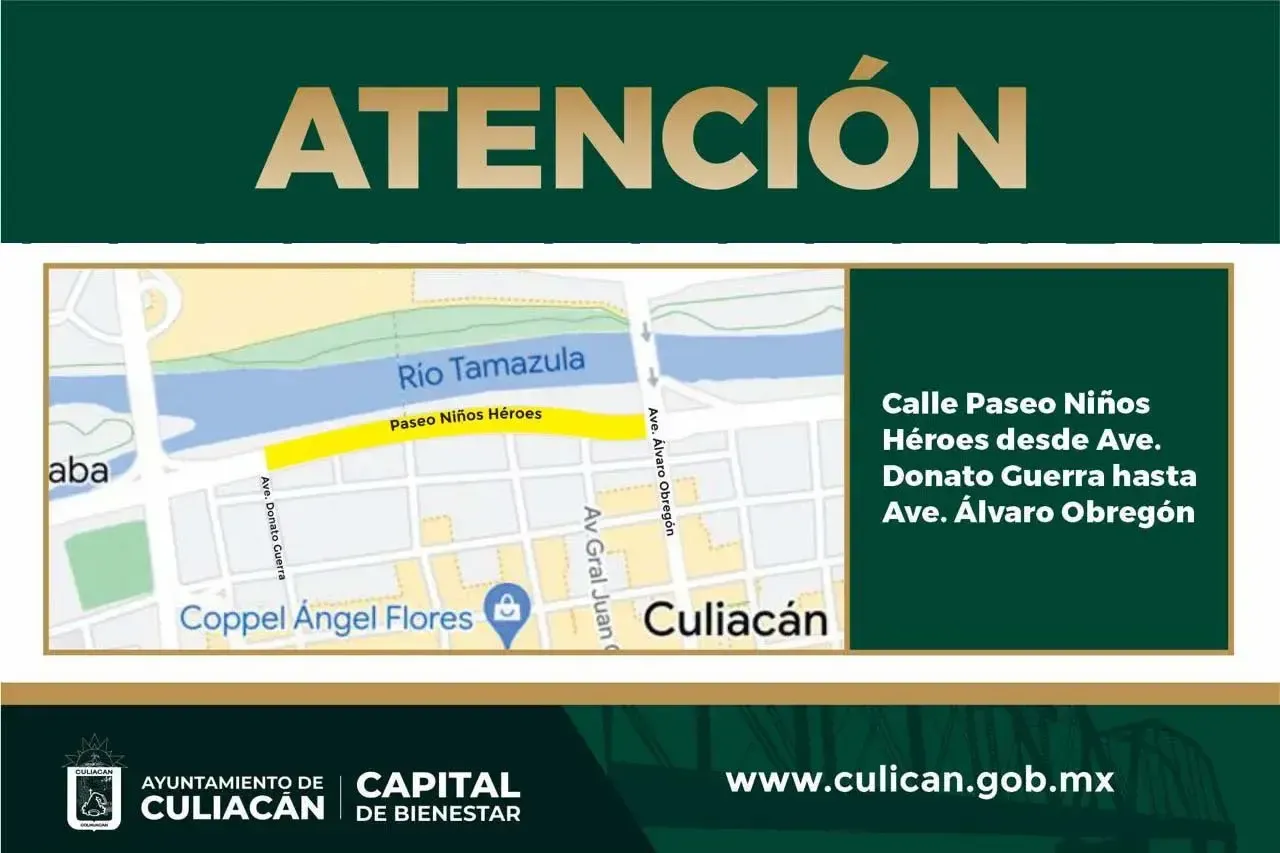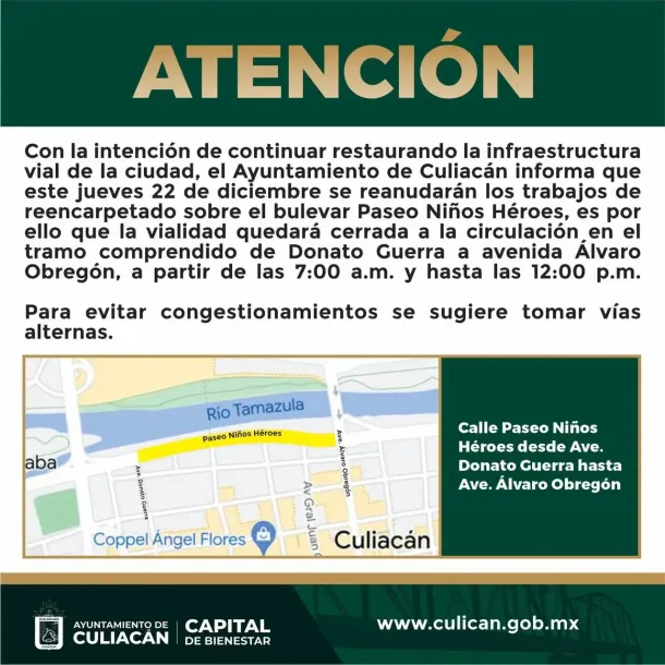 Culiacán, Sin., a 20 de diciembre de 2022.- Se informa a la ciudadanía en general, que este jueves 22 de diciembre a partir de las 7:00 a.m. y hasta las 12:00 p.m., el bulevar Paseo Niños Héroes, mejor conocido como Malecón Viejo, permanecerá cerrado en el tramo comprendido desde la avenida Donato Guerra hacia avenida Álvaro Obregón, debido a trabajos de reencarpetado.