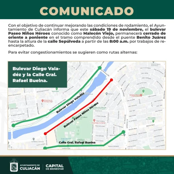 Culiacán, Sin., a 18 de noviembre del 2022.- Se informa a la ciudadanía en general que el Paseo Niños Héroes mejor conocido como Malecón Viejo, permanecerá cerrado en sentido de oriente a poniente los días 19, 20 y 21 de noviembre a partir de las 8:00 a.m.