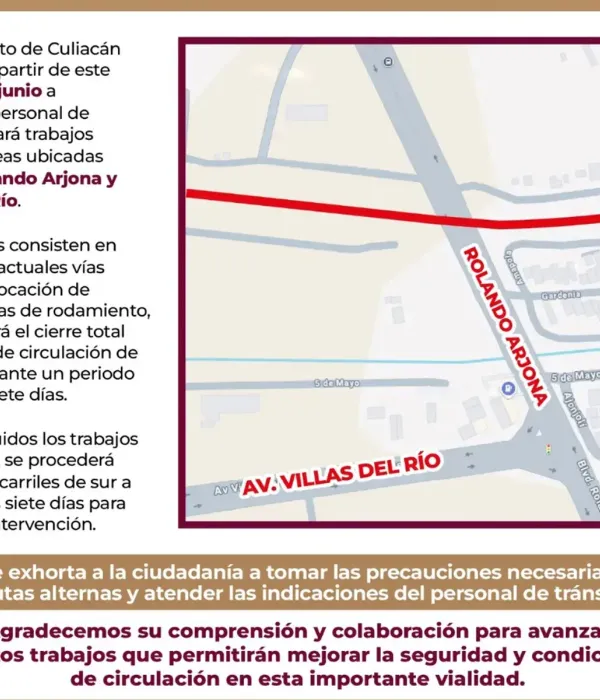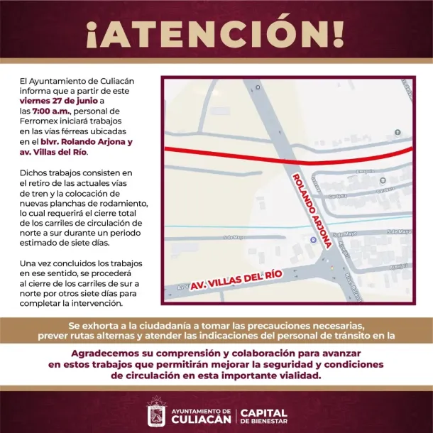 Culiacán, Sin., 26 de junio de 2025.- La Secretaría de Seguridad Pública y Tránsito Municipal informa que, debido a trabajos programados por la empresa Ferromex, se realizará el cierre temporal del bulevar Arjona en su cruce con la avenida Lola Beltrán, en sentido de norte a sur.