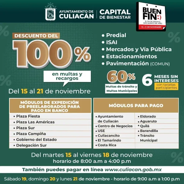 También se puede pagar en línea a través de la página oficial del Ayuntamiento en www.culiacan.gob.mx y en los diferentes módulos de expedición de preelaborados para pago en banco, siendo: Plaza Fiesta, Plaza Las Américas, Plaza Sur, Plaza La Campiña, Gobierno del Estado, y Delegación Municipal Sur.