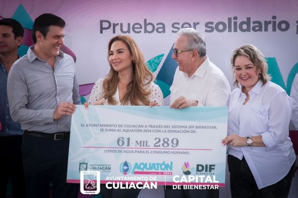 Culiacán, Sin., a 12 de junio de 2024.- El Ayuntamiento de Culiacán a través del Sistema DIF Bienestar, realizó la donación de más 61 mil litros de agua purificada a la campaña Aquatón 2024, que organizó el Sistema DIF Sinaloa, para resarcir los efectos de la sequía en el estado.
