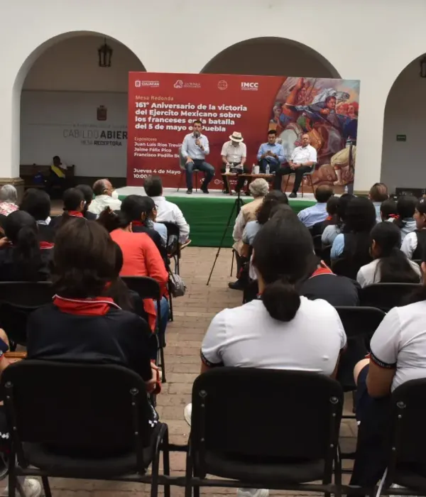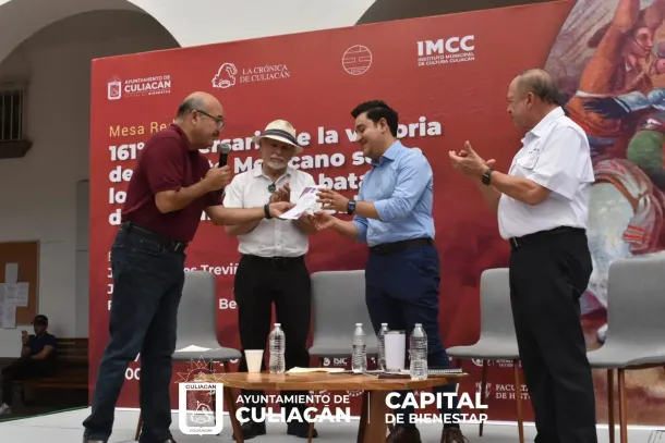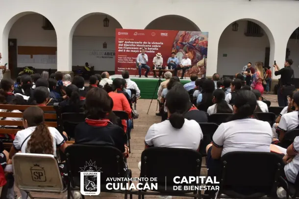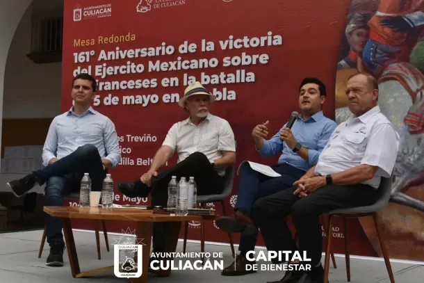 Culiacán, Sin., a 4 de mayo de 2023.- Para hablar del “161º aniversario de la victoria del Ejército Mexicano sobre los franceses en la Batalla del 5 de Mayo en Puebla”, se reunieron en mesa redonda los especialistas en el tema Juan Luis Ríos Treviño, Jaime Félix Pico y Francisco Padilla Beltrán en el patio de Palacio Municipal, en una charla dirigida a estudiantes de la escuela secundaria “Judith Gaxiola Valdés”.