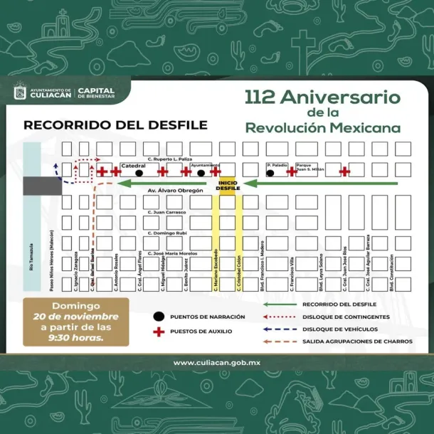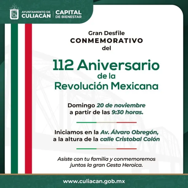 Culiacán, Sin., a 18 de noviembre de 2022.- El Ayuntamiento de Culiacán te invita a asistir al Gran Desfile Conmemorativo en honor al 112 Aniversario de la Revolución Mexicana, a realizarse el domingo 20 de noviembre a partir de las 9:30 horas.