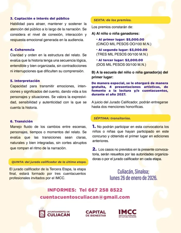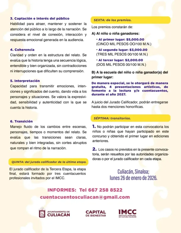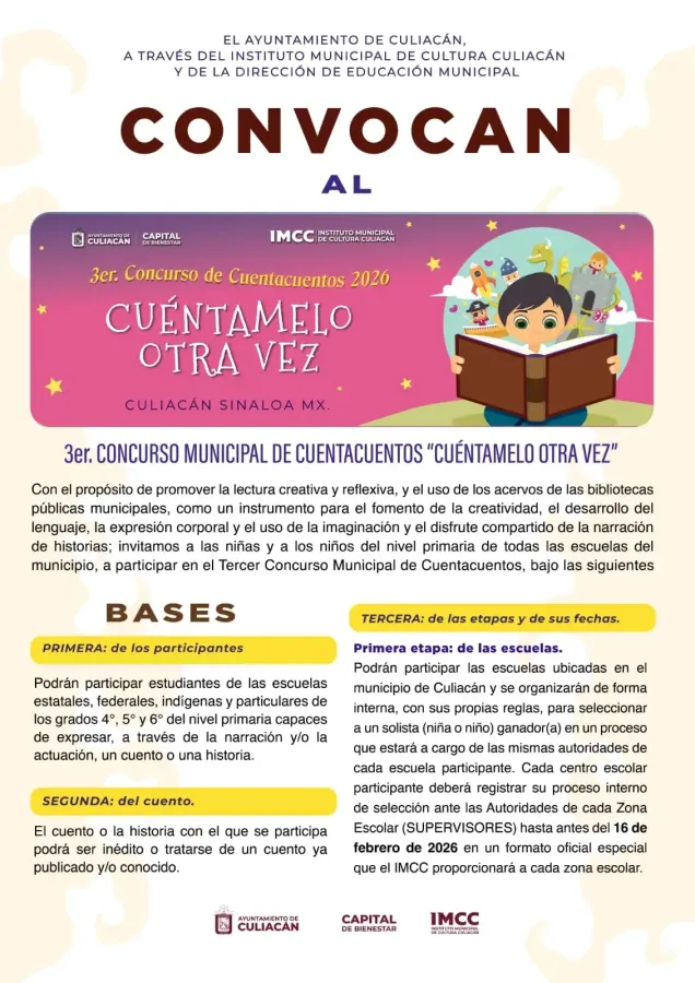 Culiacán, Sinaloa; a 26 de enero de 2026.– El Ayuntamiento de Culiacán, a través del Instituto Municipal de Cultura Culiacán y la Dirección de Educación Municipal, lanzó la convocatoria para participar en el 3er Concurso Municipal de Cuentacuentos Culiacán 2026 “Cuéntamelo otra vez”, dirigido a niñas y niños que cursan cuarto, quinto y sexto grado de primaria en escuelas del municipio.