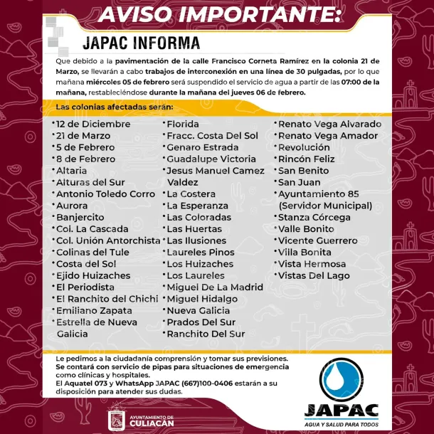 Culiacán, Sin., a 31 de enero de 2025.- JAPAC da a conocer que debido a la pavimentación de la calle Francisco Corneta Ramírez en la Colonia 21 de Marzo, se llevarán a cabo trabajos de interconexión en una línea de 30 pulgadas, por lo que será necesario suspender el suministro de agua potable en la zona.