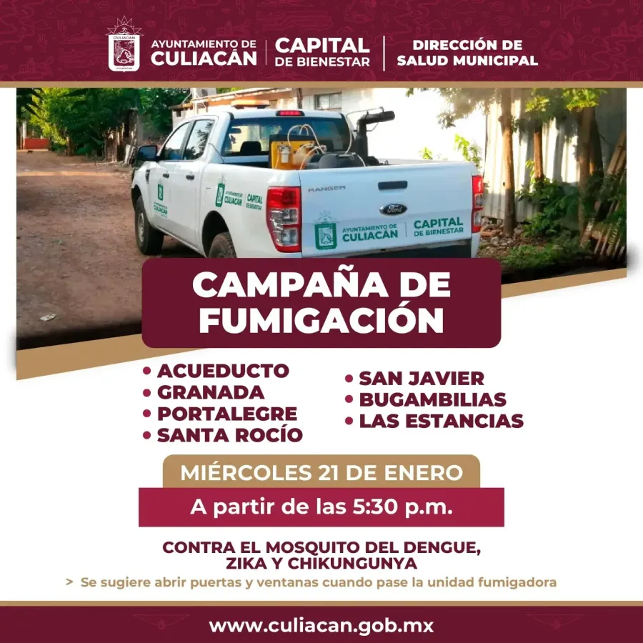 Para este miércoles 21 de enero, a partir de las 5:30 de la tarde, se tiene contemplada la fumigación en colonias como Acueducto, Granada, Portalegre, Santa Rocío, San Javier, Bugambilias y Las Estancias.