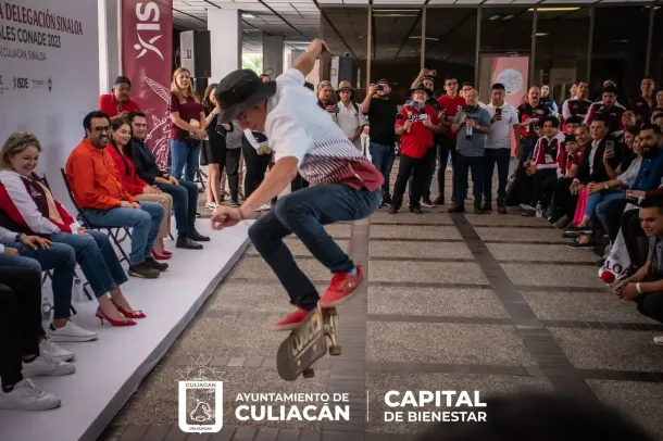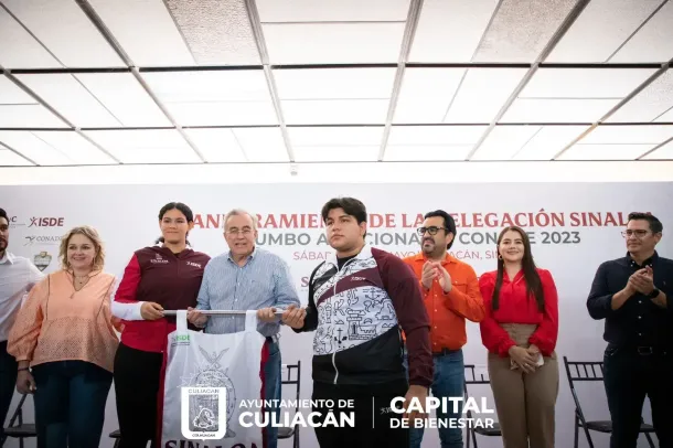 Culiacán, Sin., a 20 de mayo de 2023.- Con una gran cantidad de aplausos y mucha emotividad, se realizó en el palacio de Gobierno del Estado, la ceremonia de Entrega de Banderín a la Delegación Sinaloense que participará en los Juegos Nacionales CONADE 2023, misma que estuvo encabezada por el gobernador del Estado, Rubén Rocha moya, acompañado por el alcalde Juan de Dios Gámez Mendívil, y el director del Instituto Sinaloense del Deporte, Julio César Cascajares.