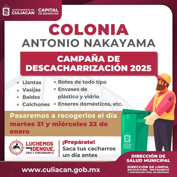Culiacán, Sin., a 20 de enero de 2025.- El Ayuntamiento de Culiacán continúa fomentando los espacios limpios y saludables mediante la Campaña de Descacharrización 2025, que se realizará este martes 21 y miércoles 22 de enero en la colonia Antonio Nakayama.