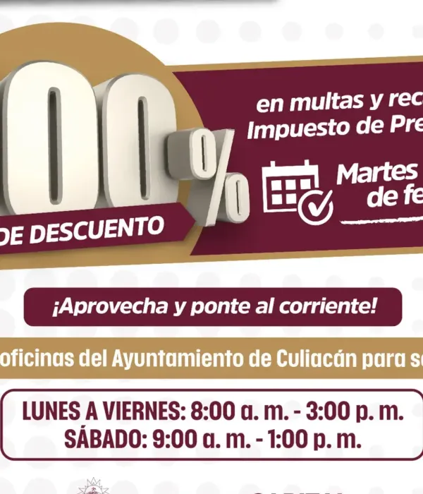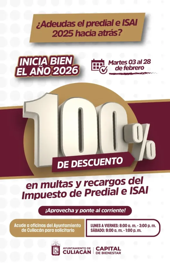 Culiacán, Sinaloa; a 6 de febrero de 2026.- Con el objetivo de apoyar la economía de las familias y fortalecer la recaudación municipal, el Ayuntamiento de Culiacán puso en marcha la promoción “Inicia Bien el Año 2026”, que contempla un 100 por ciento de descuento en multas y recargos del Impuesto Predial e ISAI, aplicable a adeudos de 2025 y años anteriores.
