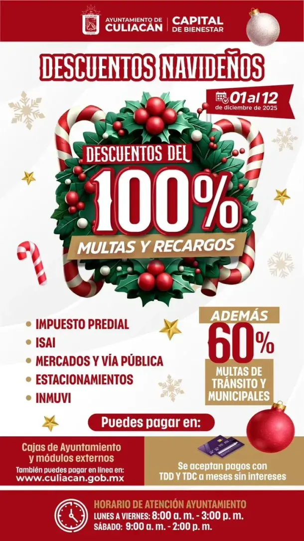 Culiacán, Sin., 01 de diciembre de 2025.- El Ayuntamiento de Culiacán puso en marcha la campaña “Descuentos Navideños”, un programa que estará vigente del 1 al 12 de diciembre y que tiene como propósito apoyar la economía de las familias durante esta temporada decembrina, facilitando que la ciudadanía pueda ponerse al corriente en sus contribuciones municipales.