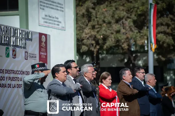 Culiacán, Sin., a 15 de febrero de 2023.- El alcalde Juan de Dios Gámez Mendívil y el gobernador del Estado, Rubén Rocha Moya, acudieron a la ceremonia de destrucción de armamento decomisado y puesto a disposición de la Secretaría de la Defensa Nacional, llevada a cabo en las instalaciones de la Novena Zona Militar.