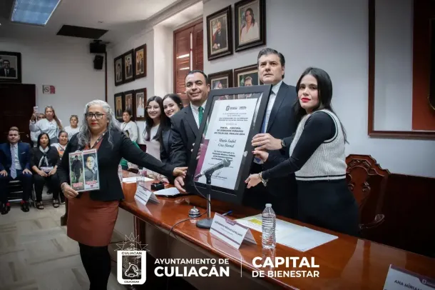 Culiacán, Sin., a 17 de diciembre de 2024.- En Sesión Solemne de Cabildo, la destacada activista María Isabel Cruz Bernal recibió el Premio Municipal de Derechos Humanos de Culiacán, en reconocimiento a su incansable labor a favor de las madres de personas desaparecidas.
