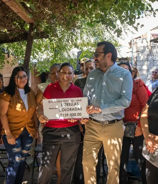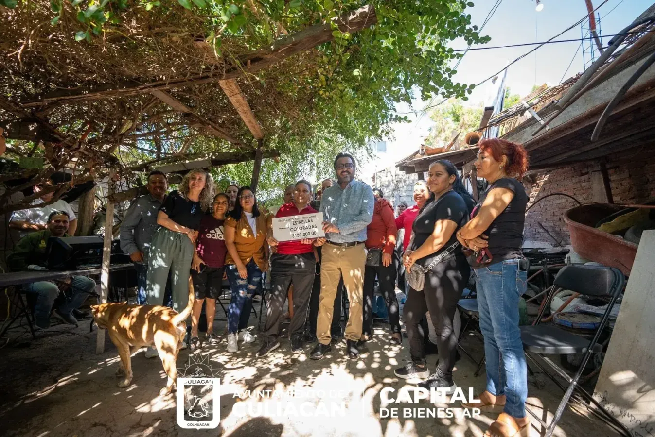 Culiacán, Sinaloa; 25 de noviembre de 2025.- En una jornada más de impulso a la economía local, el presidente municipal Juan de Dios Gámez Mendívil entregó un cheque por 139 mil pesos al grupo Estrellas Coloradas, integrado por 13 mujeres participantes del programa Mujeres Emprendedoras por el Bienestar.