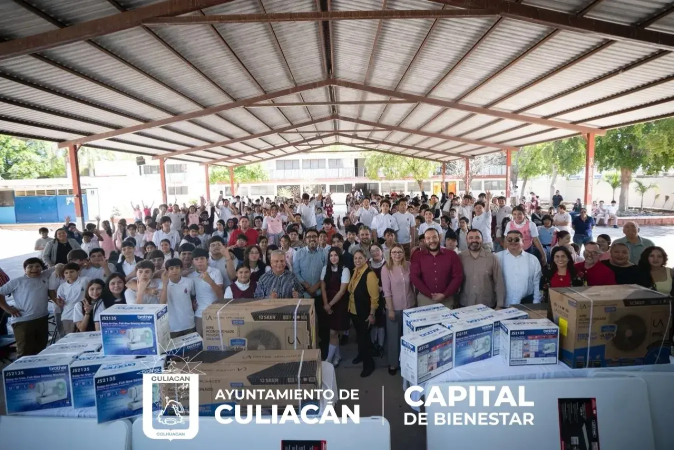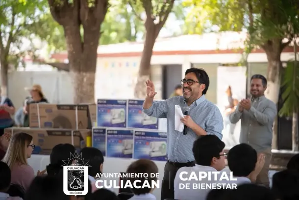 Culiacán, Sinaloa; a 21 de abril de 2026.- En respuesta a compromisos acordados el 24 de marzo con la comunidad escolar de la secundaria No. 5 “Juan de Dios Bátiz Paredes”, este martes el alcalde Juan de Dios Gámez Mendívil acudió al plantel educativo para hacer entrega de 15 máquinas de coser, dos minisplits y cuatro mesas (tablones), destinados a fortalecer el taller de costura.