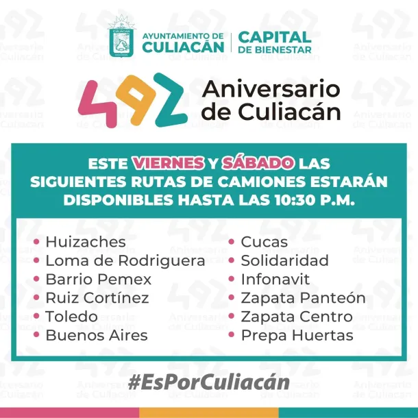 Culiacán, Sin., a 27 de septiembre de 2023.- Para que toda la ciudadanía pueda acudir a los Festejos del 492 Aniversario de Culiacán, se extenderá el servicio de transporte urbano.