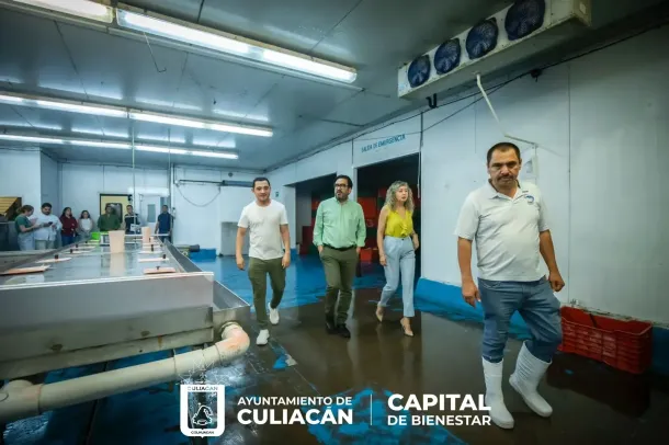 Durante el encuentro, Juan de Dios Gámez, y la secretaria de Desarrollo Económico Municipal, Janeth Faviola Tostado Noriega, recorrieron las instalaciones de la congeladora de alimentos del mar, en compañía de José Alberto Romero Astorga, director general de dicha empresa.