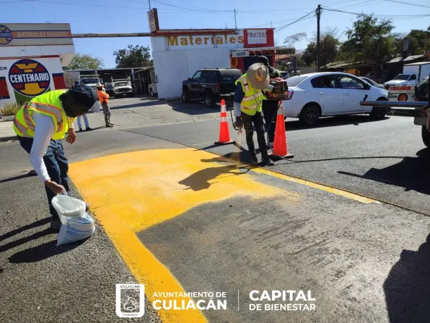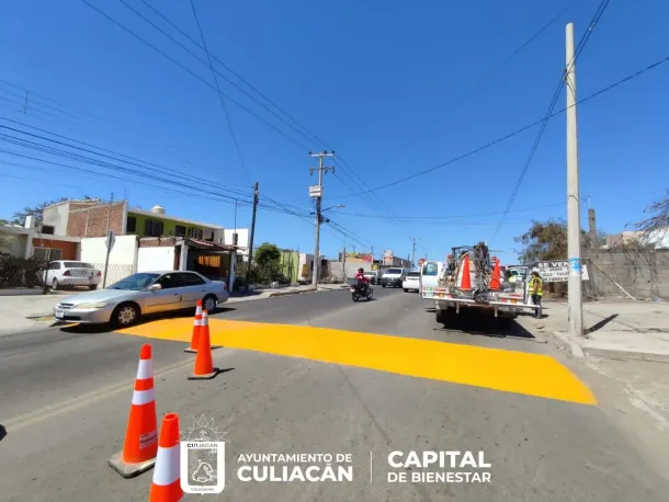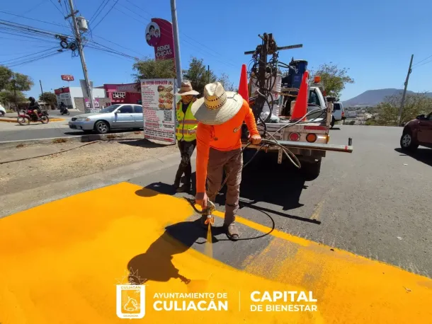 Culiacán, Sin., a 16 de marzo de 2023.- Esta mañana, personal de diversas áreas del Ayuntamiento de Culiacán, llevó a cabo la construcción y el pintado de reductores de velocidad ubicados sobre la calle Puerto Madero y el bulevar Maquío Clouthier, respectivamente.