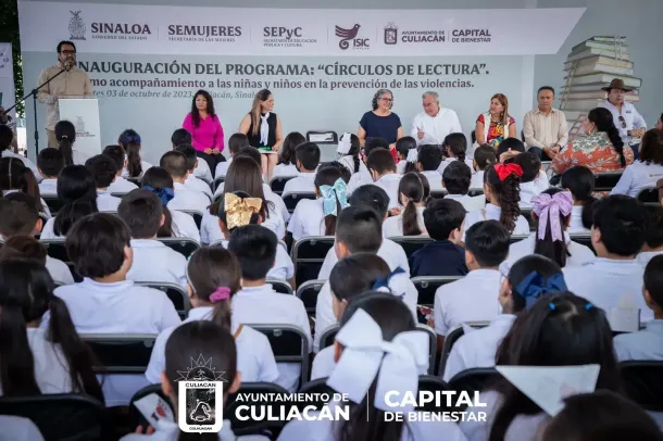 Culiacán, Sin., a 03 de octubre de 2023.- En una emotiva ceremonia en la Primaria Estatal de Alturas del Sur, el alcalde Juan de Dios Gámez Mendívil, se unió a la inauguración del Programa "Círculos de Lectura, como acompañamiento a las niñas y niños en la prevención de las violencias", encabezada por el gobernador del Estado, Rubén Rocha Moya.