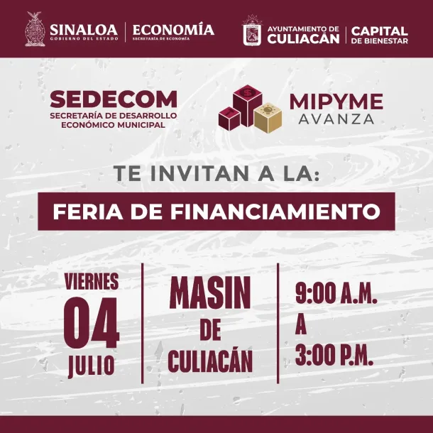 Culiacán, Sin., a 1 de julio de 2025.- Con el propósito de que empresas, emprendedores, inversionistas y actores relevantes del sector económico accedan a opciones de financiamiento y capital para sus proyectos, la Secretaría de Economía y el Ayuntamiento de Culiacán, invitan a participar en la "Feria de Financiamiento + Capital 2025", que se llevará a cabo el próximo 04 de julio, en un horario de 09:00 de la mañana a 03:00 de la tarde en el Museo de Arte de Sinaloa (MASIN) de esta ciudad.