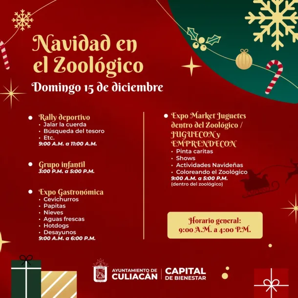 El domingo 15 de diciembre, el evento continuará en el Zoológico de Culiacán, donde los asistentes podrán disfrutar de un Rally Deportivo como: jalar la cuerda, búsqueda del tesoro entre otras actividades, esto en horario de 9 a 11 de la mañana. Un grupo infantil dará un show a también a partir de las 3 hasta las 5.