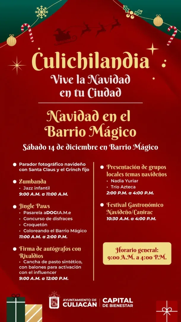 Culiacán, Sin., a 12 de diciembre de 2024.- El Ayuntamiento de Culiacán invita a todas las familias a disfrutar de “Culichilandia: Vive la Navidad en tu Ciudad”, un evento especial que se llevará a cabo este fin de semana en dos sedes: el Barrio Mágico (Paseo del Ángel) y el Zoológico de Culiacán.