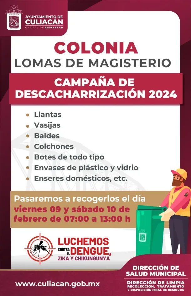 Por lo que exhorta a los habitantes de la colonia Lomas de Magisterio, a colaborar en la próxima jornada de descacharrización, misma que se realizará los días viernes 09 y sábado 10 de febrero, en horario de 7:00 a 13:00 horas.