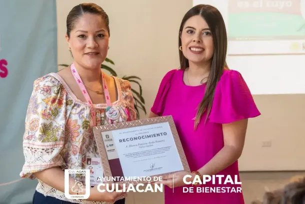 Al concluir la jornada, la presidenta del Sistema DIF Bienestar Culiacán, Irma Nidya Gasca Aldama, entregó un reconocimiento a la doctora Blanca Patricia Ayala, titular del Programa de Cáncer de la Mujer de la Secretaría de Salud del Estado.