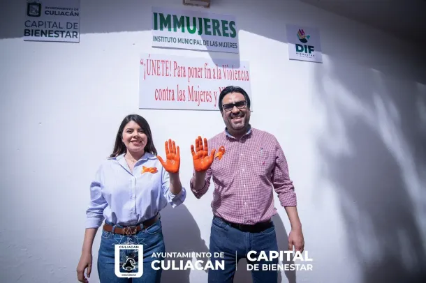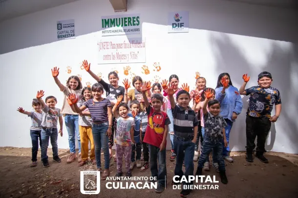 Y como parte de las acciones para erradicar la violencia, el IMMUJERES efectuó la pinta de manos color naranja en un mural del plantel educativo.