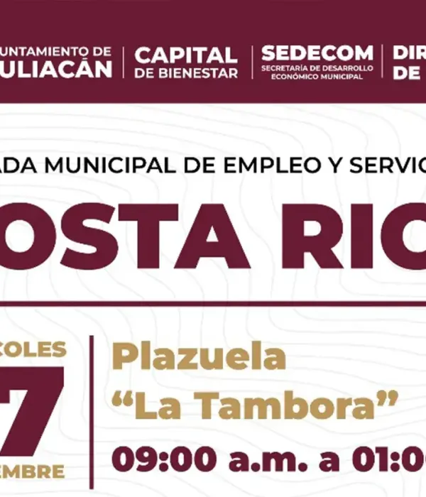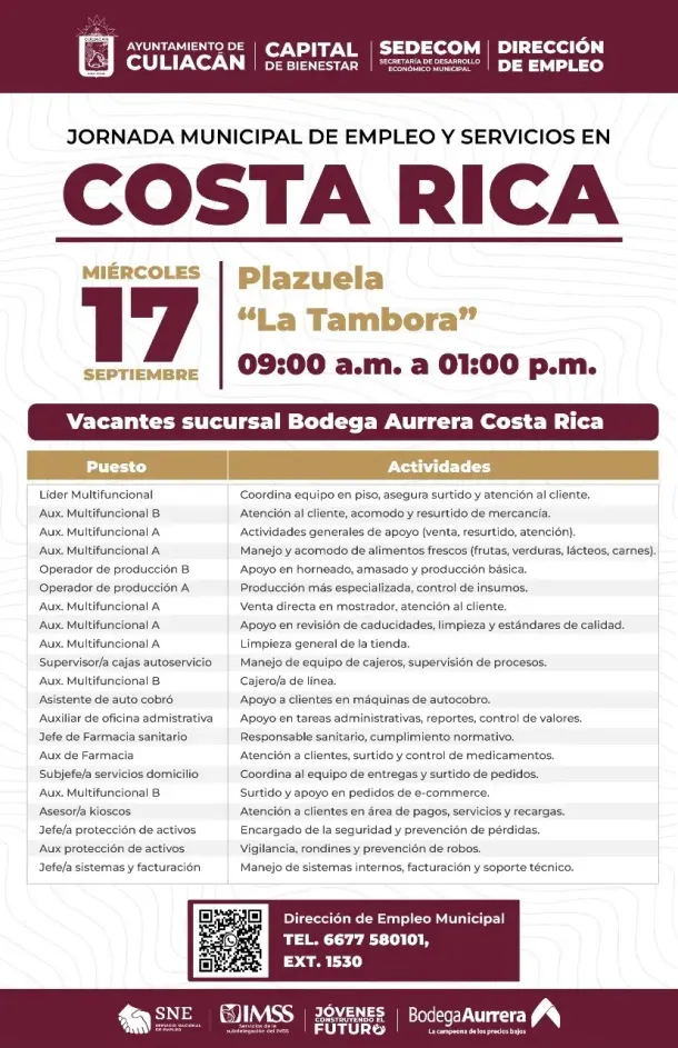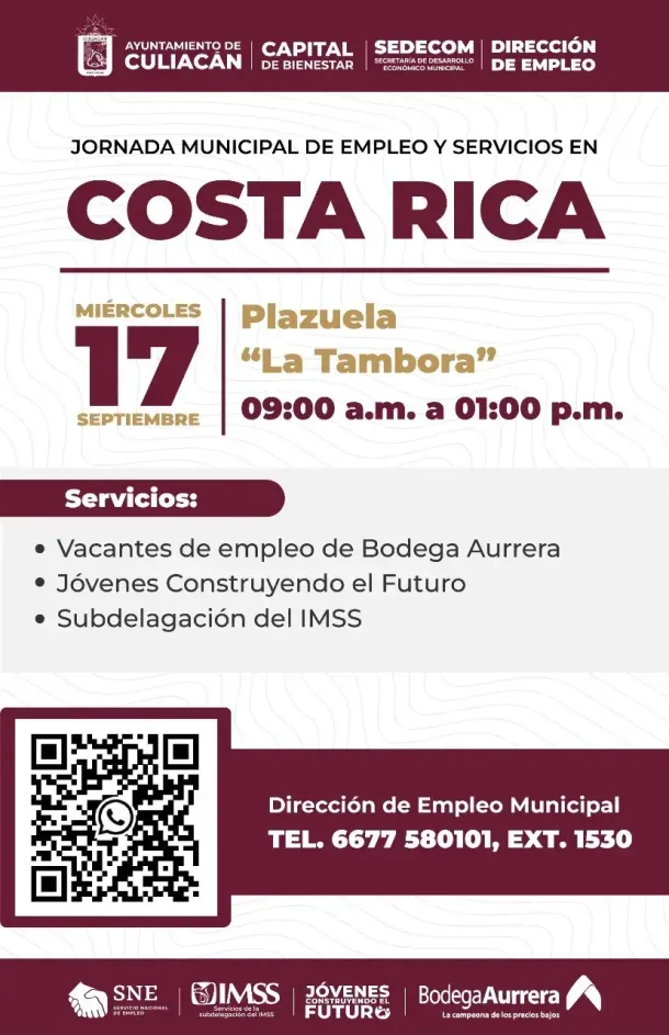 Culiacán, Sin., 12 de septiembre de 2025.- El próximo miércoles 17 de septiembre, el Ayuntamiento de Culiacán llevará a cabo una Jornada Municipal de Empleo y Servicios en la sindicatura de Costa Rica, donde se ofertarán vacantes para la nueva sucursal de Bodega Aurrerá.