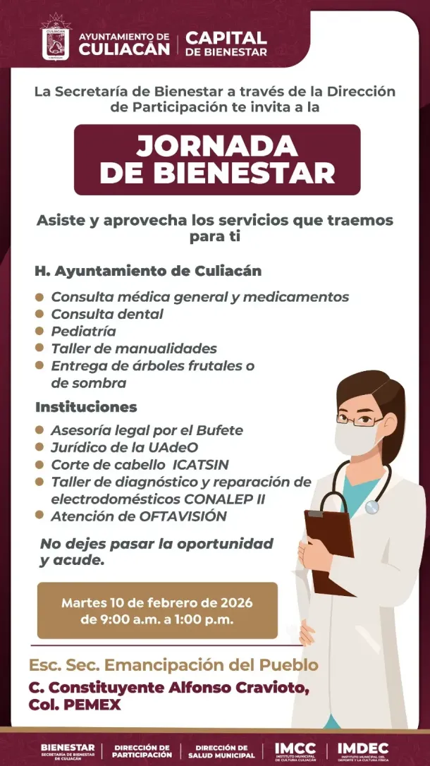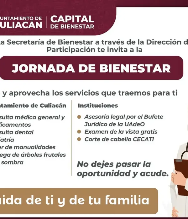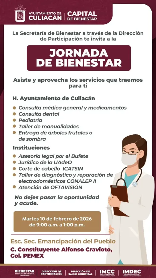 Culiacán, Sinaloa; a 9 de febrero de 2026.- La Secretaría de Bienestar, a través de la Dirección de Participación, invita a la ciudadanía a aprovechar la Jornada de Bienestar, un evento pensado para acercar servicios gratuitos y de atención integral a la población, con el respaldo del H. Ayuntamiento de Culiacán.