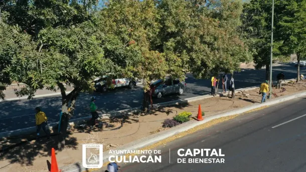 Culiacán, Sin., a 15 de febrero de 2023.- El proyecto de jardines ornamentales por sistema de goteo, avanza en diversos bulevares de la ciudad, especialmente sobre el Paseo Niños Héroes zona en la que se desplegó una cuadrilla de trabajadores para llevar a cabo la plantación y colocación de tuberías de plástico.