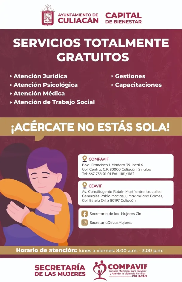 Asimismo, la Secretaría de las Mujeres recordó que, en coordinación con COMPAVIF, se ofrecen servicios gratuitos como: