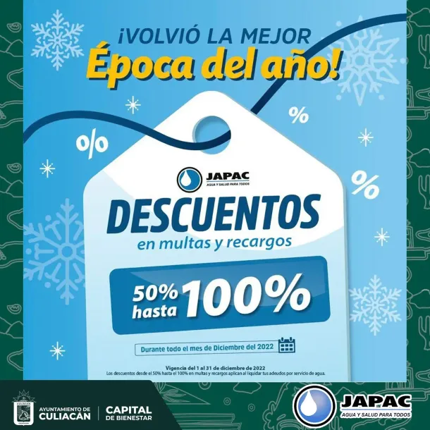 Culiacán, Sin., a 30 de noviembre de 2022.- Los descuentos desde el 50 hasta el 100 por ciento en multas y recargos se ampliarán durante todo el mes de diciembre, anuncia la Junta Municipal de Agua Potable y Alcantarillado de Culiacán.
