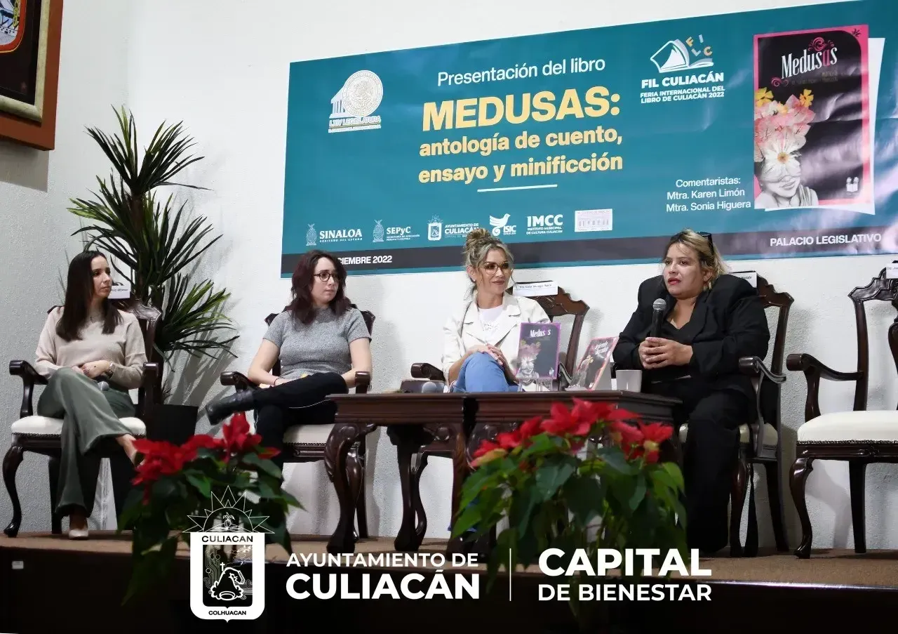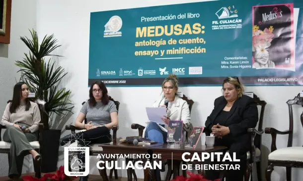 Culiacán, Sin., a 9 de diciembre de 2022.- Como parte de las actividades de la Feria Internacional del Libro Culiacán 2022, en su sede alterna situada en el Congreso del Estado de Sinaloa, se realizó la presentación del libro, "Medusas: antología de cuento, ensayo y minificción", obra literaria que recopila interesantes ideas e historias personales de mujeres inquietas y valientes.
