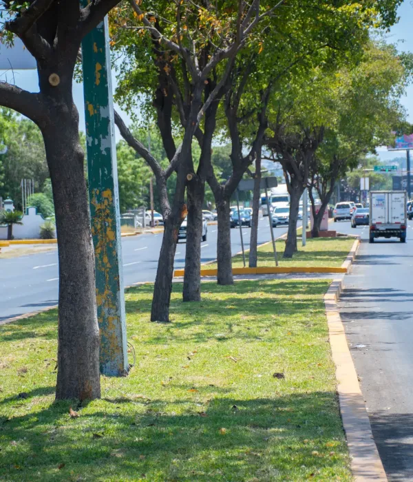 Otro de los ejes de intervención es la instalación de césped en el camellón central, donde se ha optado por pasto tipo San Agustín, una especie resistente a las condiciones climáticas de la región y que requiere menor mantenimiento. Para su adecuado crecimiento, se ha utilizado tierra orgánica tratada con minerales, proporcionada por la Junta Municipal de Agua Potable y Alcantarillado de Culiacán (JAPAC).