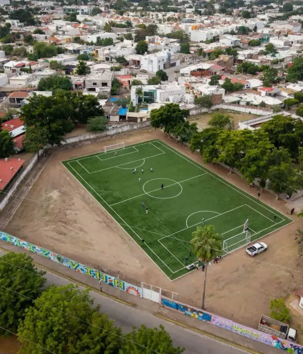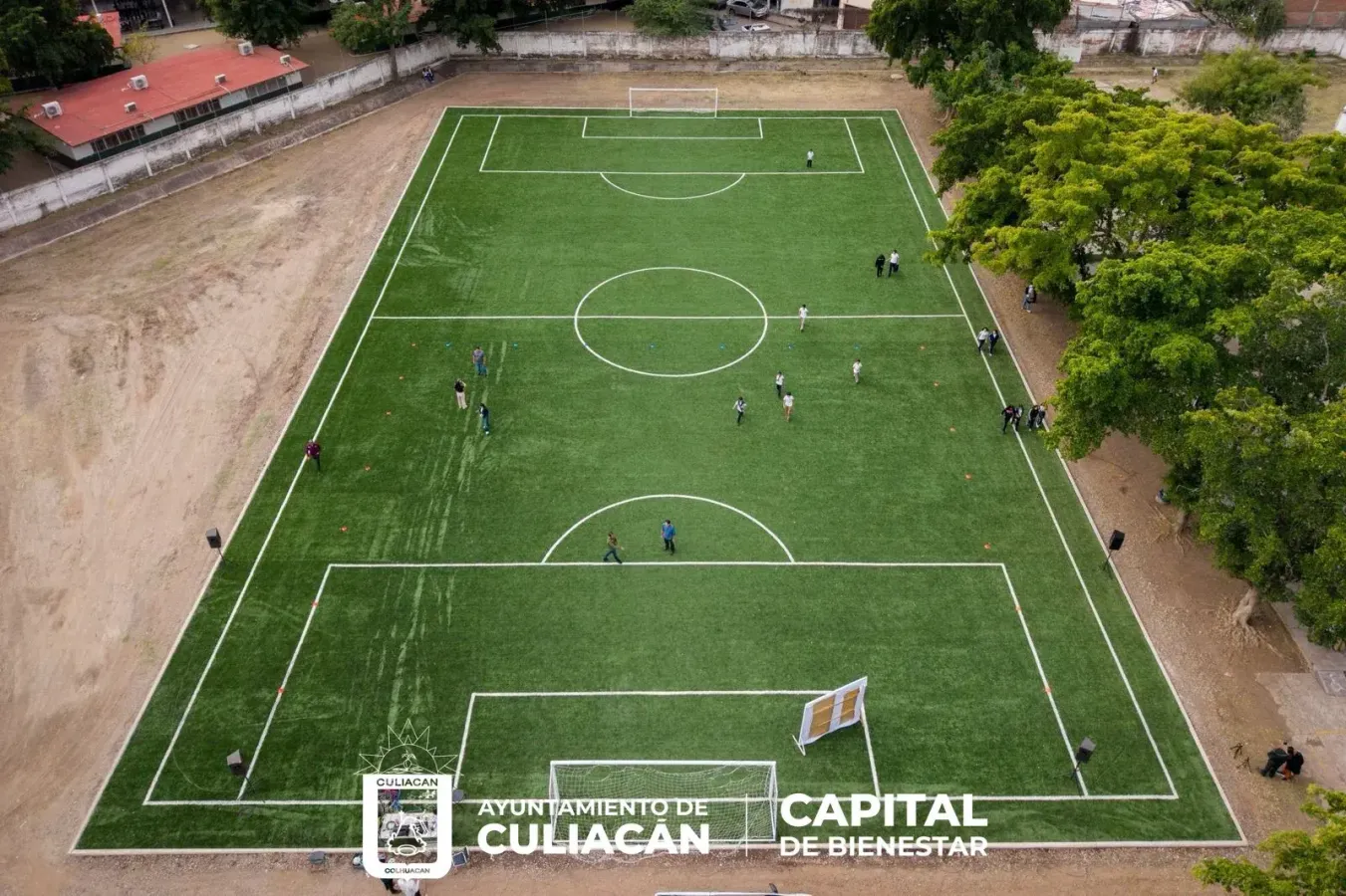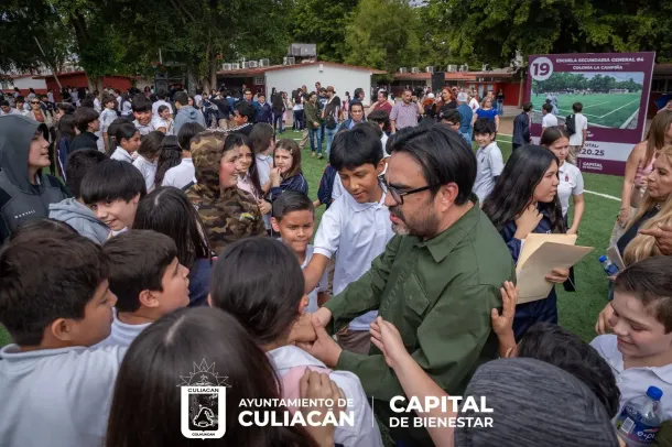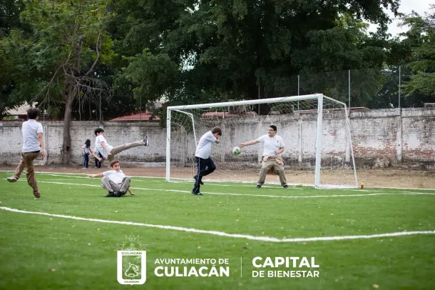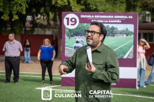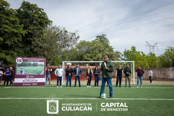 Culiacán, Sinaloa, a 20 de enero de 2026.– El alcalde Juan de Dios Gámez Mendívil entregó una cancha de fútbol con pasto sintético en la escuela secundaria General No. 4 “Pablo de Villavicencio”, ubicada en la colonia Campiña, en Culiacán.