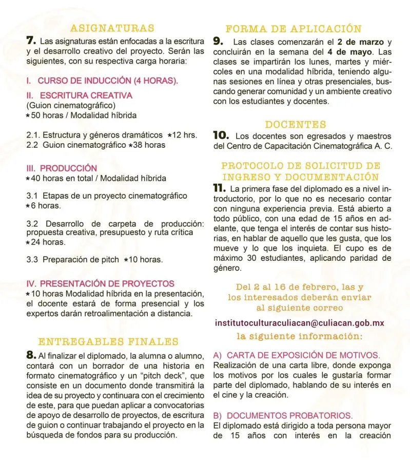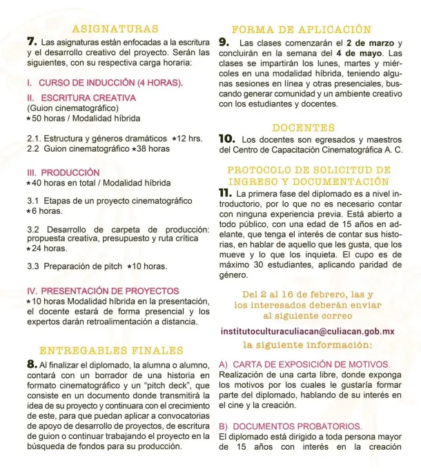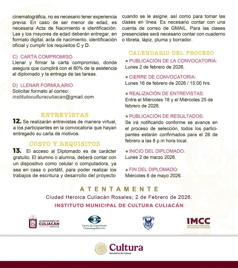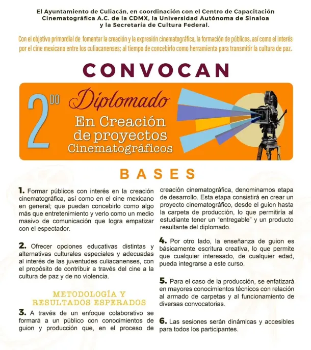 Culiacán, Sinaloa; a 10 de febrero de 2026.- El Ayuntamiento de Culiacán recuerda que este domingo 16 de febrero cierra la convocatoria para participar en el Segundo Diplomado en Creación de Proyectos Cinematográficos, dirigido a personas mayores de 15 años interesadas en el desarrollo de proyectos de cine con enfoque cultural y de paz.