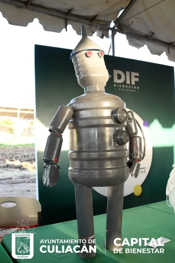 Dereck Beltrán Ramírez a través de su ingenio hizo al "Hombre de Hojalata", reutilizando un garrafón de agua, botes de aluminio, tubos de plástico y embudo, obteniendo con ello el primer lugar y merecedor de 3 mil pesos en efectivo.