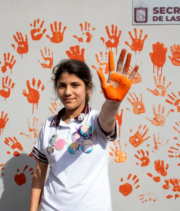 La primera actividad fue “Únete: Pinta de Manos”, dinámica en la que las asistentes impregnaron su mano derecha con pintura naranja y la plasmaron en un muro, simbolizando su unión al movimiento, así como su rechazo absoluto a la violencia en cualquiera de sus formas.